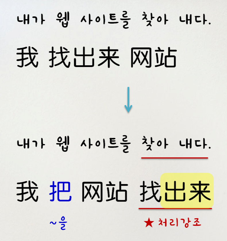기본문장 '我找出来网站(내가 웹 사이트를 찾아 내다.)'입니다. 이때 ‘找出来(‘找(동사. 찾다)’ + ‘出来(방향보어. 나오다)’) = 찾아 내다.’를 강조하기 위해 ‘把’를 활용해서 목적어인 ‘网站(웹 사이트)’를 앞으로 보냅니다. 그럼 여기서는 '出来'가 기타 성분이 되겠죠? 그럼 '把'자문으로 만들어 보겠습니다.