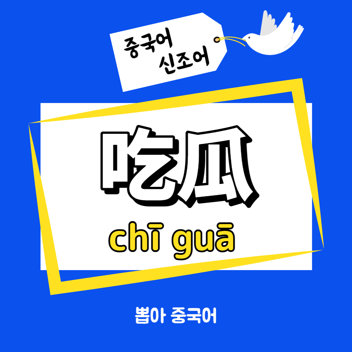 그럼 단어의 구조는 ‘吃瓜[chī guā]’, 단어 그대로 해석하면 '수박을 먹다'이지만 위의 설명처럼 신조어로 '구경하다, 알아보다, 들어보다'의 뜻으로 쓰입니다. 결론은 자기와는 상관이 없지만 호기심으로 알고 싶은 내용을 '구경하다, 알아보다, 들어보다'라는 표현입니다.