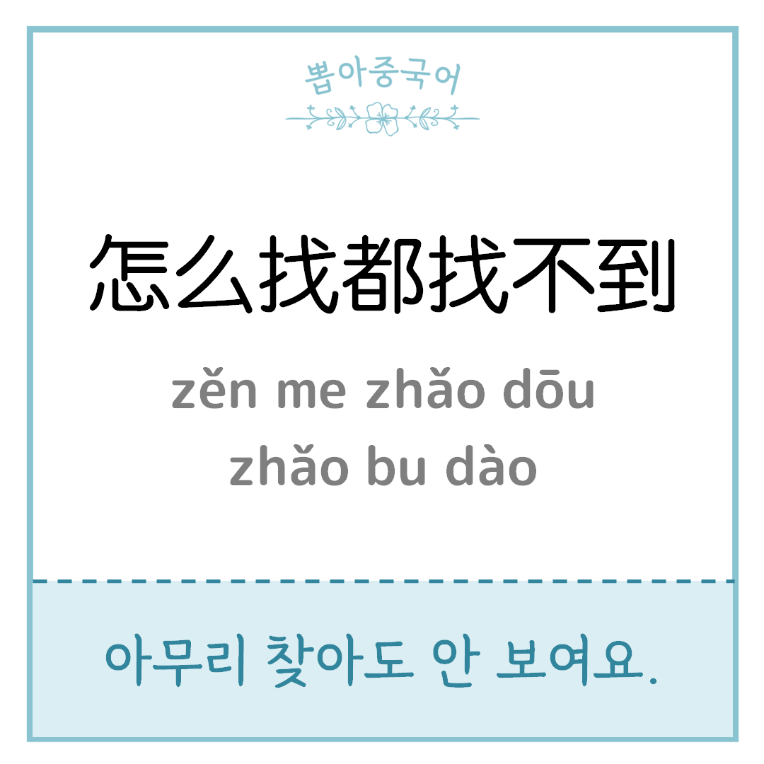 - ‘找(찾다)’뒤에 ‘到(결과보어/목적 달성)’을 붙이면 ‘找到(찾았다)’라고 해석하시면 됩니다. 이때 ‘到’가 크게 해석이 되지는 않지만 이루고자 하는 동작을 이루었음을 나타냅니다. 그럼 '~할 수 있다/~할 수 없다'의 가능을 나타내는 가능보어 문장으로 만들려면 동사와 결과보어 사이에 ‘得’ 혹은 ‘不’를 넣으시면 됩니다. 오늘의 문장은 부정문이니 ‘不’를 넣으면 되겠죠? 그럼 ‘找不到(찾을 수 없다)’의 뜻이 됩니다. 최종 해석은 ‘怎么找都(아무리 찾아도)’ + ‘找不到(찾을 수 없다)’입니다.