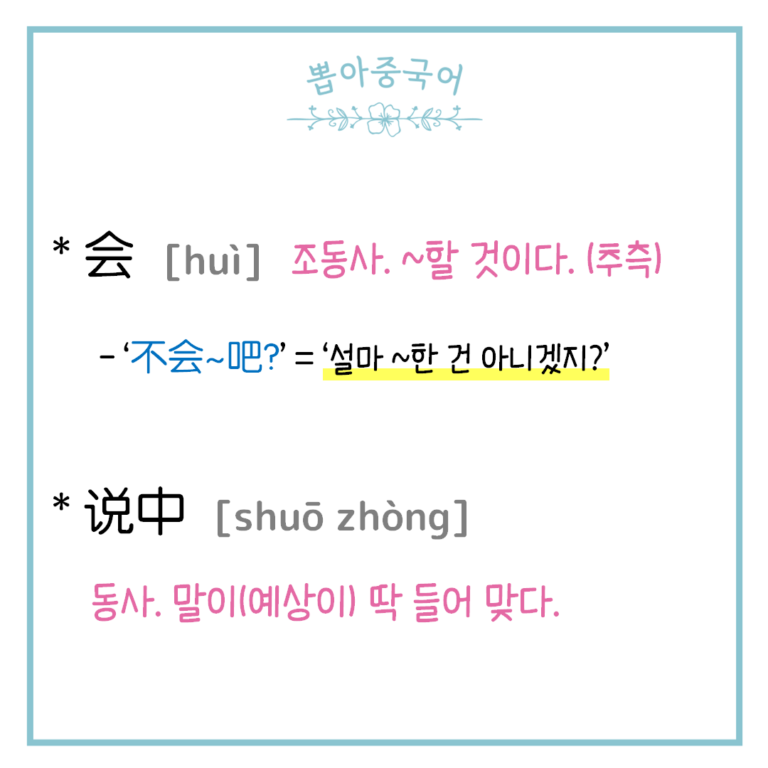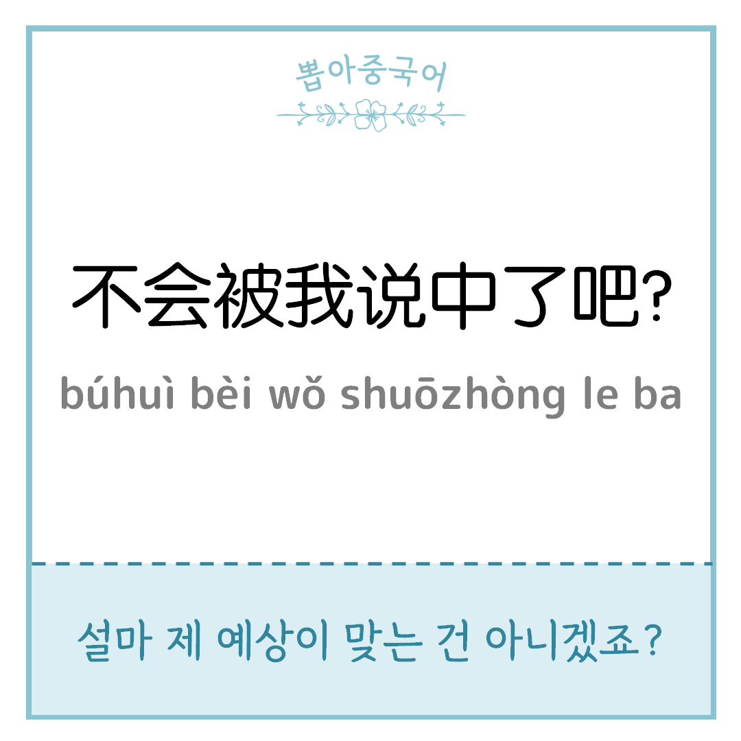 - ‘不会~吧?(설마 ~한 건 아니겠지?)’의 표현과 함께 쓰면 오늘의 문장이 완성됩니다. ‘不会被我说中了吧?(설마 제 예상이 맞는 건 아니겠죠?)’.