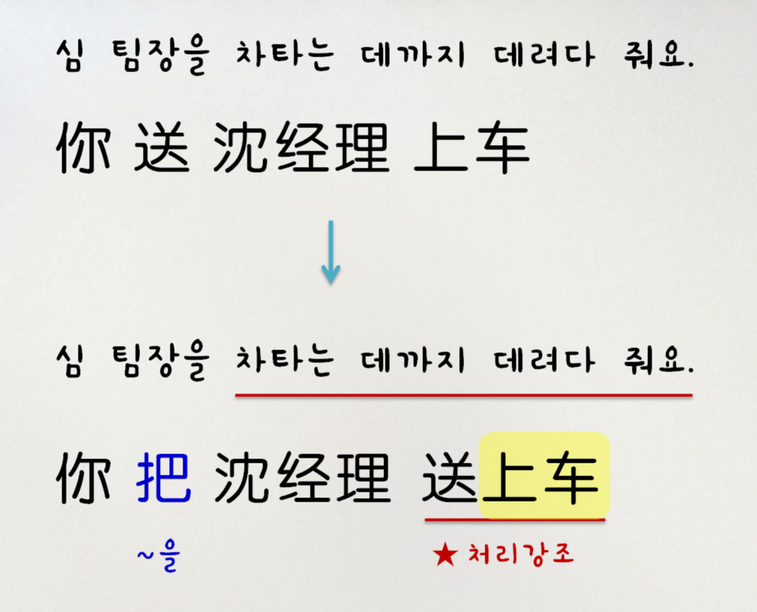 기본 문장 ‘你送沈经理上车(심 팀장을 차 타는 데까지 데려다주다, 차 타는 걸 보다)’이며, ‘送上车’를 강조하며 명령하기 위해 ‘把’ 자문을 씁니다. 그럼 여기서는 ‘上车’가 기타 성분이 되겠죠? 그럼 ‘把’ 자문을 활용하여 명령문으로 바꿔보겠습니다.