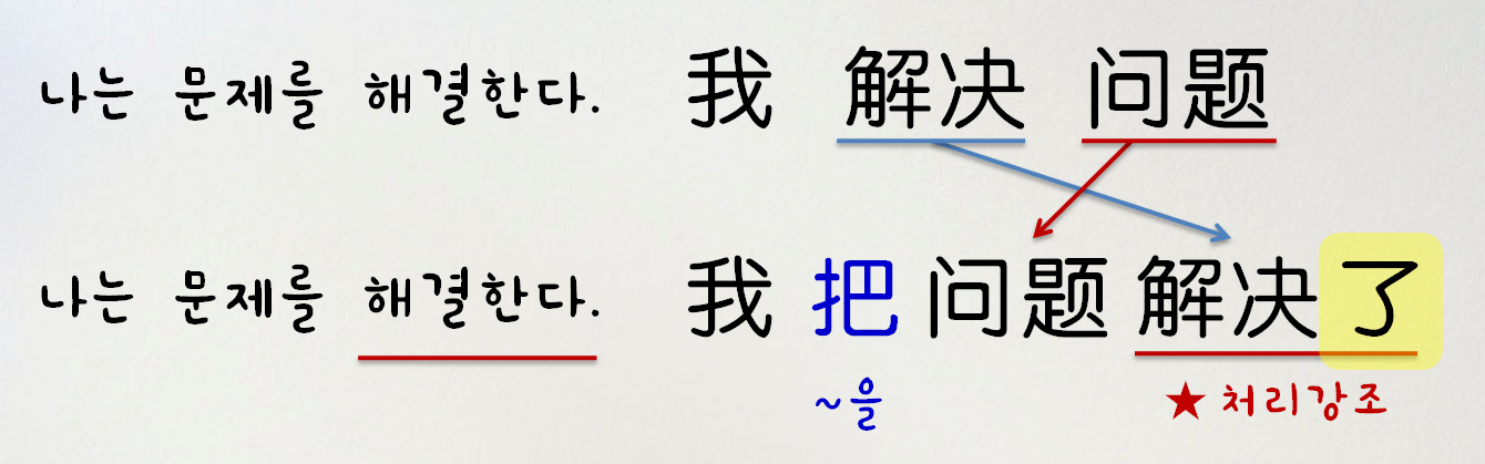 - ‘把’ 자문 크게 3가지 경우로 나눌 수 있습니다. ① 동작의 처리 강조, ② 명령문, ③ 필수로 써야 하는 경우, 이렇게 세 가지입니다. 오늘 문장에 쓰인 것은 ① 동작의 처리 강조에 해당하며 오늘은 여기에 중점을 두고 공부해 보겠습니다.(나머지는 따로 '把'자문만 정리해서 포스팅하겠습니다.)