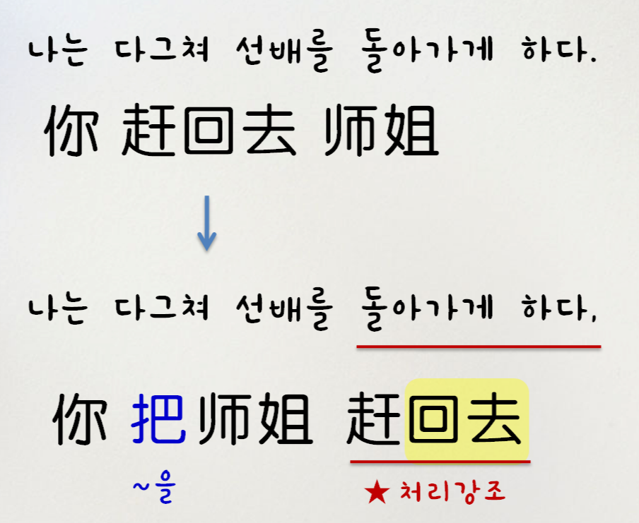 기본 문장 '赶回去师姐', 동사 ‘赶(다그치다, 내쫓다)' 뒤에 '回去(돌아가다)'를 붙여 '다그쳐 돌아가게 하다'로 해석하시면 됩니다. 그럼 여기서는 '回去'가 기타 성분이 되겠죠? 그럼 '把'자문을 활용하여 명령문으로 바꿔보겠습니다.