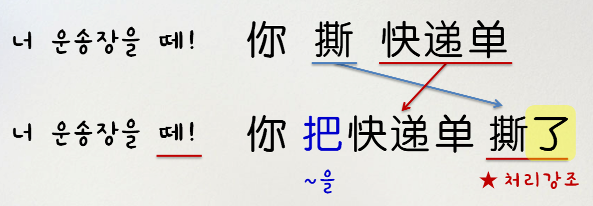 기본 문장 ‘把快递单斯了’, 동사 ‘斯(떼다)’뒤에 ‘了(완료)’를 붙여, 아직 완료한 문장은 아니지만 명령문에서 사용하면 '~해 버려'라는 강한 명령의 표현이 됩니다. 그럼 여기서는 ‘了’가 기타 성분이 되겠죠? 그럼 ‘把’ 자문을 활용하여 명령문으로 바꿔보겠습니다.