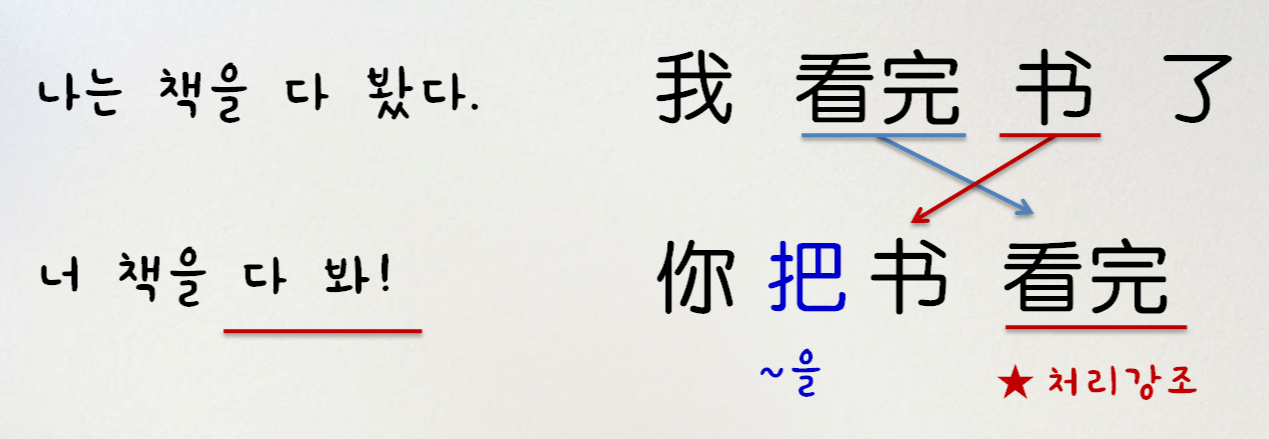 - ↑위의 문장을 ‘把’를 써서 ↓아래와 같이 명령문으로 바꿔보겠습니다. 우선 목적어인 '书(책)'을 앞으로 보내면 '把书(책을)'이라고 해석되겠죠? 그럼 '너 책을'하는 순간 자동으로 '그것을 어떻게 하라고?'라는 생각이 들며 뒤에 오는 동작에 집중하게 됩니다. 그다음에 '看完(다 봐)'를 넣으면 자동적으로 동작의 처리가 강조가 되는 것입니다. 그래서 중국어에서 ‘把’ 자문은 동작의 처리, 처치 강조라고 해서 '처치 문'이라고도 합니다.